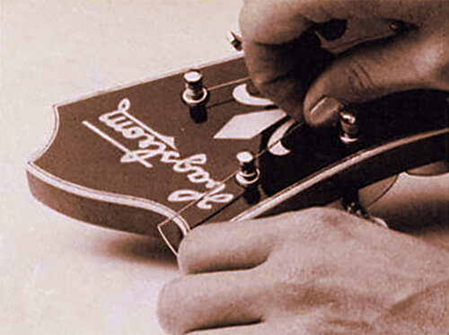 Bring each string up the neck and make a 90-degree bend in the end about 2 inches beyond the proper tuning machine. Insert the string into the hole of the string post. Wind the end of the string halfway around the post and under the attached string. The end of the string is then bent back over the attached string to prevent slippage.