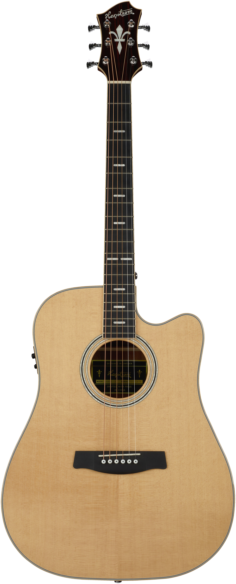 Ovangkol is a material with the appearance and density of rosewood. Hagstrom has selected this material because it is safely harvested from managed forests and fully compliant under all of the CITES endangered hardwood regulations. When married to a solid Sitka spruce top Ovangkol produces the warm, full spectrum sound associated with rosewood.Our dreadnought body shape enhances the guitar’s bass response. The Orsa’s body, fingerboard, and headstock are exquisitely bound with hard Maple, creating a refined accompaniment to the rich colors of the Ovangkol back and sides. A Maple heel cap completes the elegant incorporation of organic materials into the ornamental design of the guitar. A fingerboard and bridge made of our unique Resinator™ material, with the density, hardness, and sophisticated texture of ebony, contribute a level of tonal articulation usually found only in much more expensive instruments.